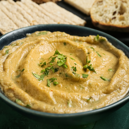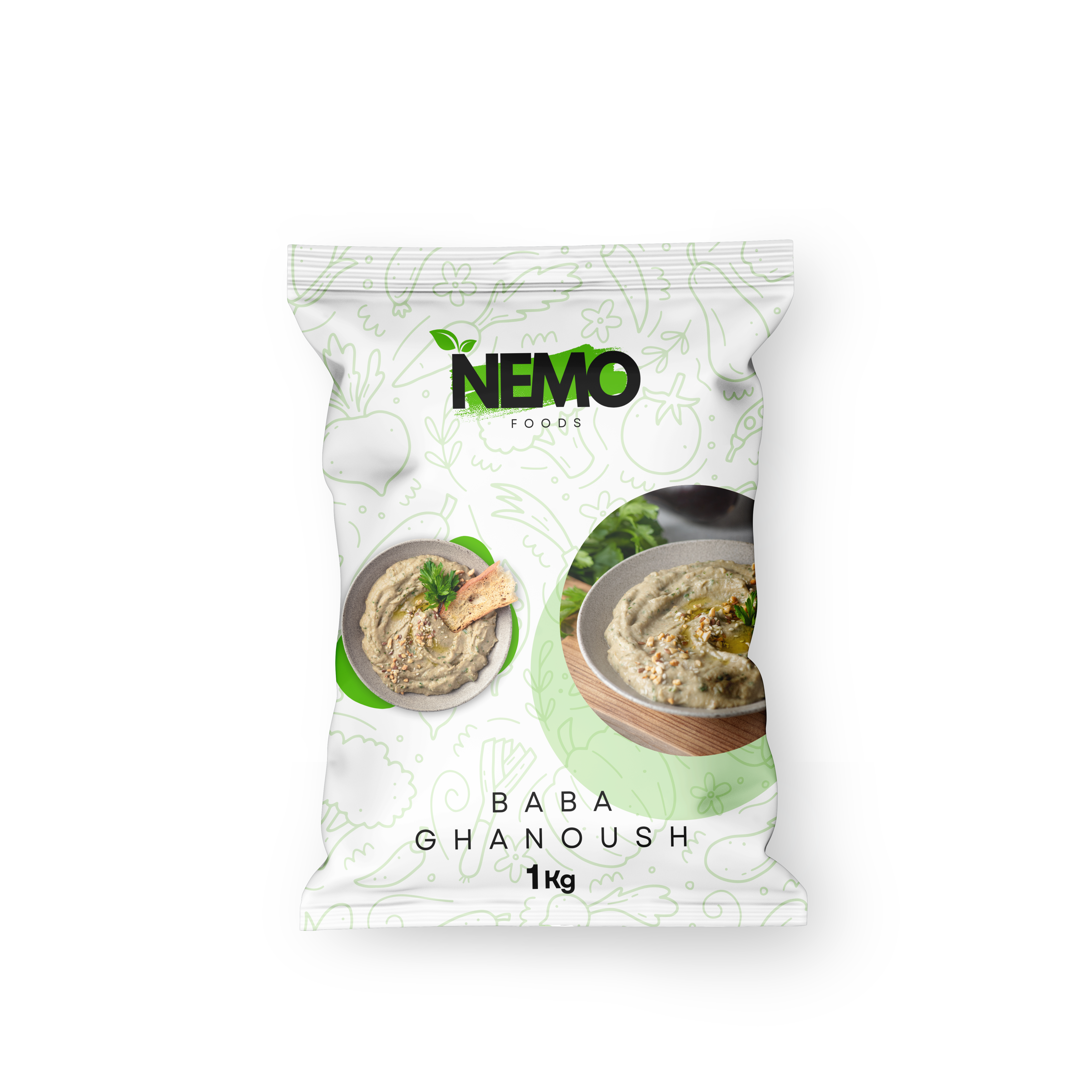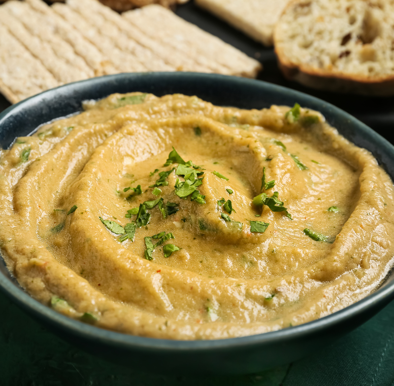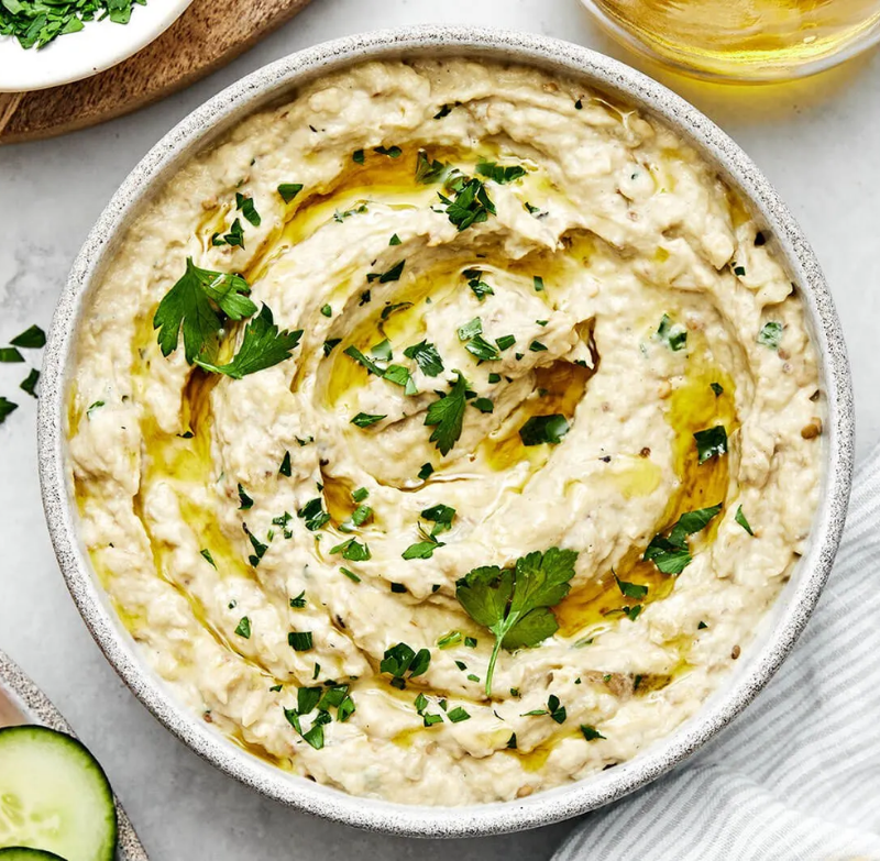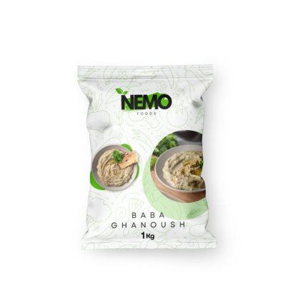 Creamy baba ghanoush frozen to preserve its smoky flavor and smooth texture. Packaged in 1kg options, perfect for dips and appetizers.