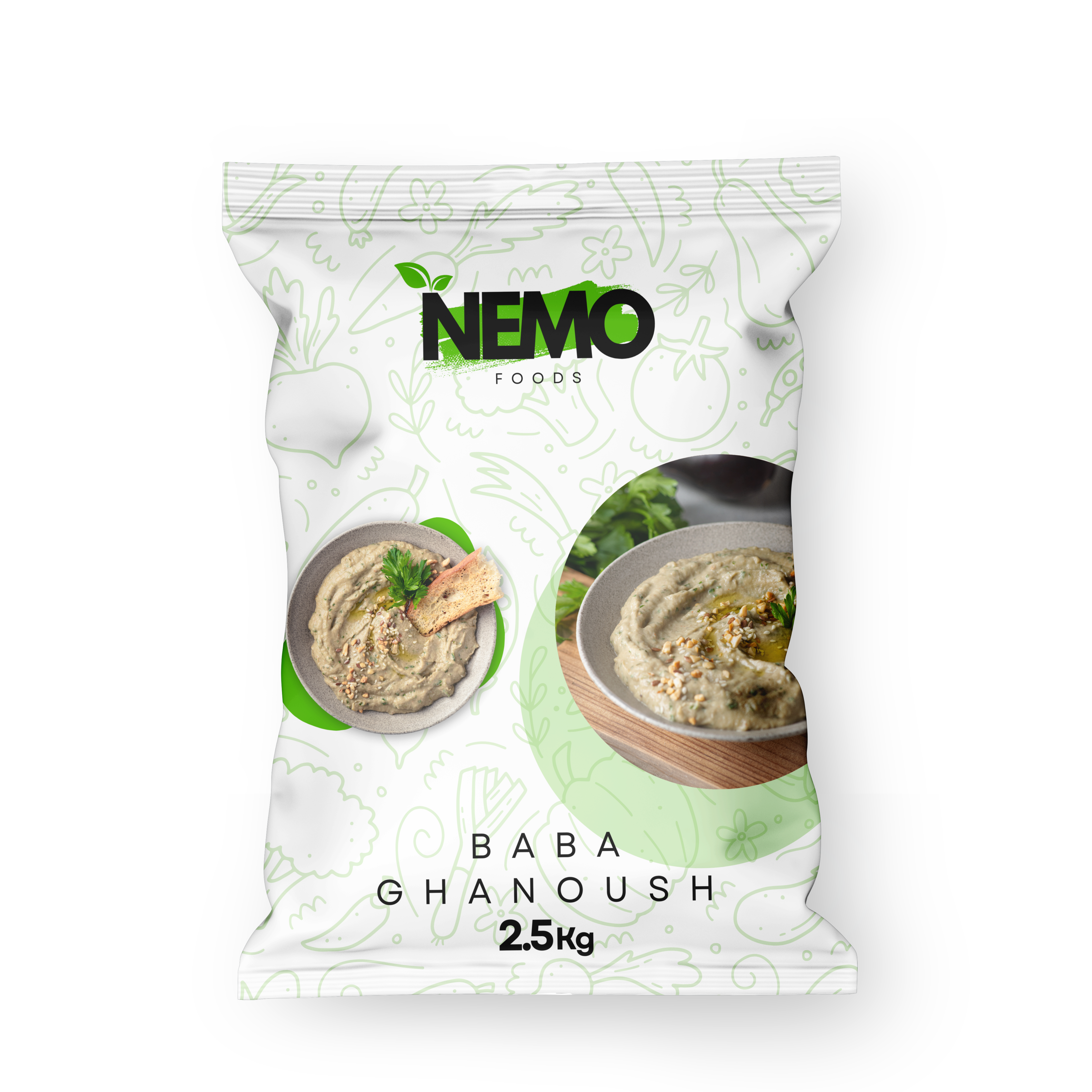Creamy baba ghanoush frozen to preserve its smoky flavor and smooth texture. Packaged in 2.5kg options, perfect for dips and appetizers.