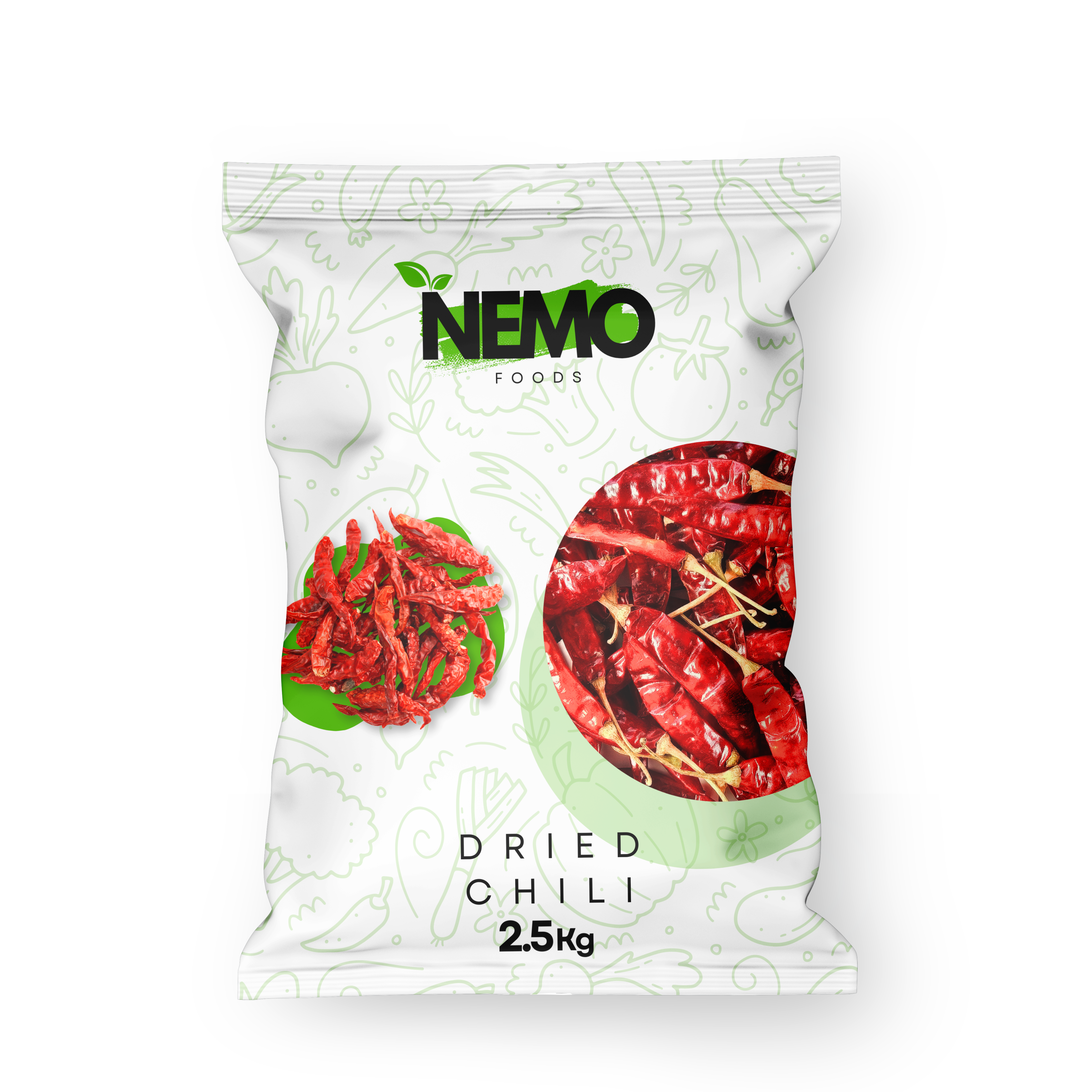 Whole red chilies in a fiery 2.5kg pack, great for adding heat to oils, sauces, or spice blends.