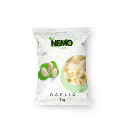 Freshly chopped and frozen garlic, preserving its strong aroma and flavor. Available in 1kg packs, perfect for adding depth to any recipe.