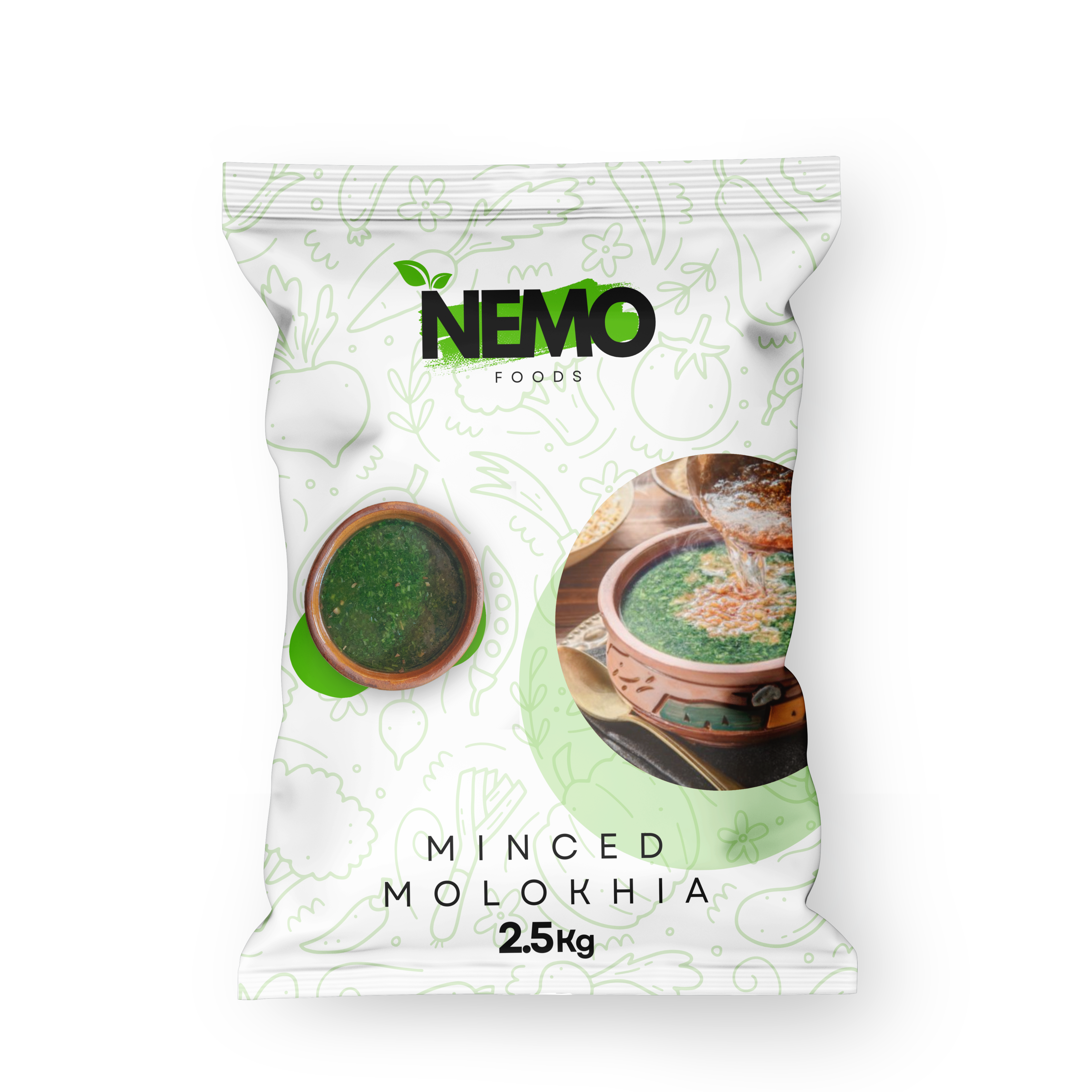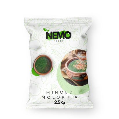 Finely minced molokhia leaves, frozen to preserve their fresh flavor and texture. Available in 2.5kg packs, ideal for quick cooking.